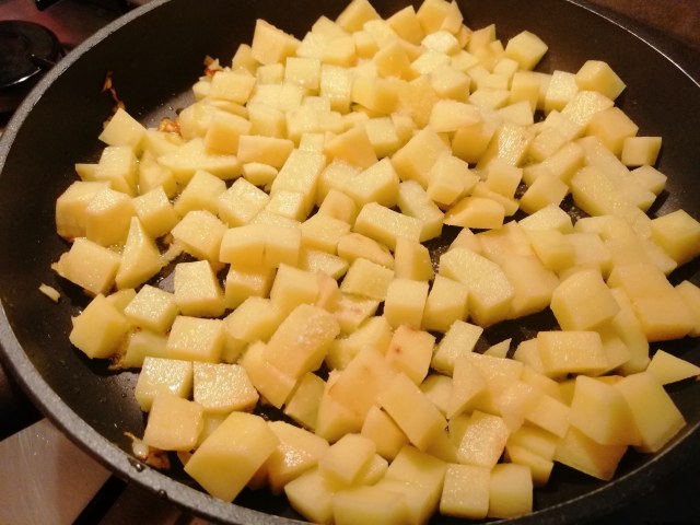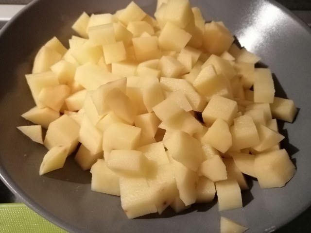 Sbucciate e tagliate a tocchetti grossi le patate viola e mettetele a lessare in acqua salata.