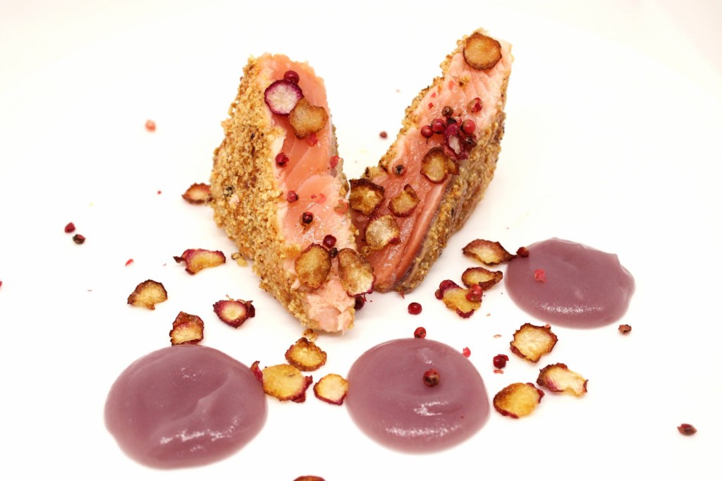 Eliminate pelle e lische residue dal vostro trancio di salmone e fatelo andare in padella (anche qui in olio e.v.o.), rompendolo, poi, lungo le linee della carne.